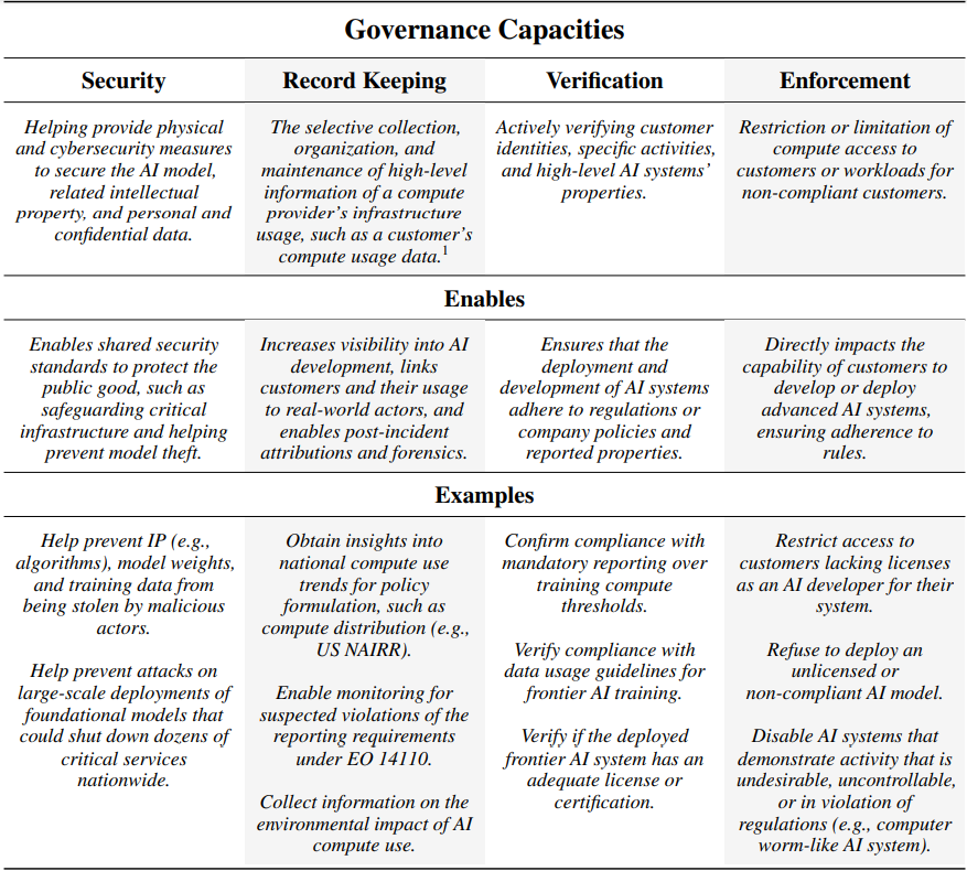 Governance Capacities — We propose that compute providers can leverage their crucial role in the AI supply chain to secure infrastructure and serve as the intermediate node in support of regulatory objectives while maintaining customers’ privacy and rights. They can facilitate effective AI regulation via four key capacities: as securers, record keepers, verifiers, and, in some cases, even enforcers. Reporting represents a related yet distinct dimension, wherein compute providers provide information to authorities as mandated by law or regulations. (Section 2)