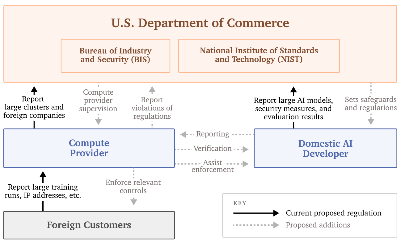 Constructing an Oversight Scheme — Via EO 14110 the US government is already beginning to implement recordkeeping roles for compute providers by requiring them to implement a Customer Identification Program (essentially a Know-Your-Customer (KYC) program) for foreign customers, and to report foreign customer training of highly capable models to government. Expanding the role of compute providers to also record and validate domestic customers using compute at frontier AI thresholds could enable the US government to identify and address AI safety risks arising domestically. Complementing these measures with verification and enforcement roles for compute providers could further enable the construction of a comprehensive compute oversight scheme, and ensure that AI firms and developers are complying with AI regulations. (Section 4)