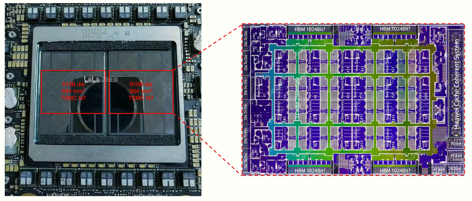 Unlike NVIDIA's advanced packaging in the B100/200 series, the 910C likely uses a less technically sophisticated approach with two separate silicon interposers connected by an organic substrate.