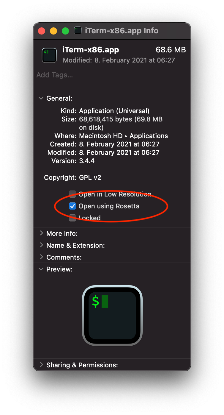 1) Create a copy of the terminal of your choice (I'm using iTerm). I renamed it to "iTerm-x86".
