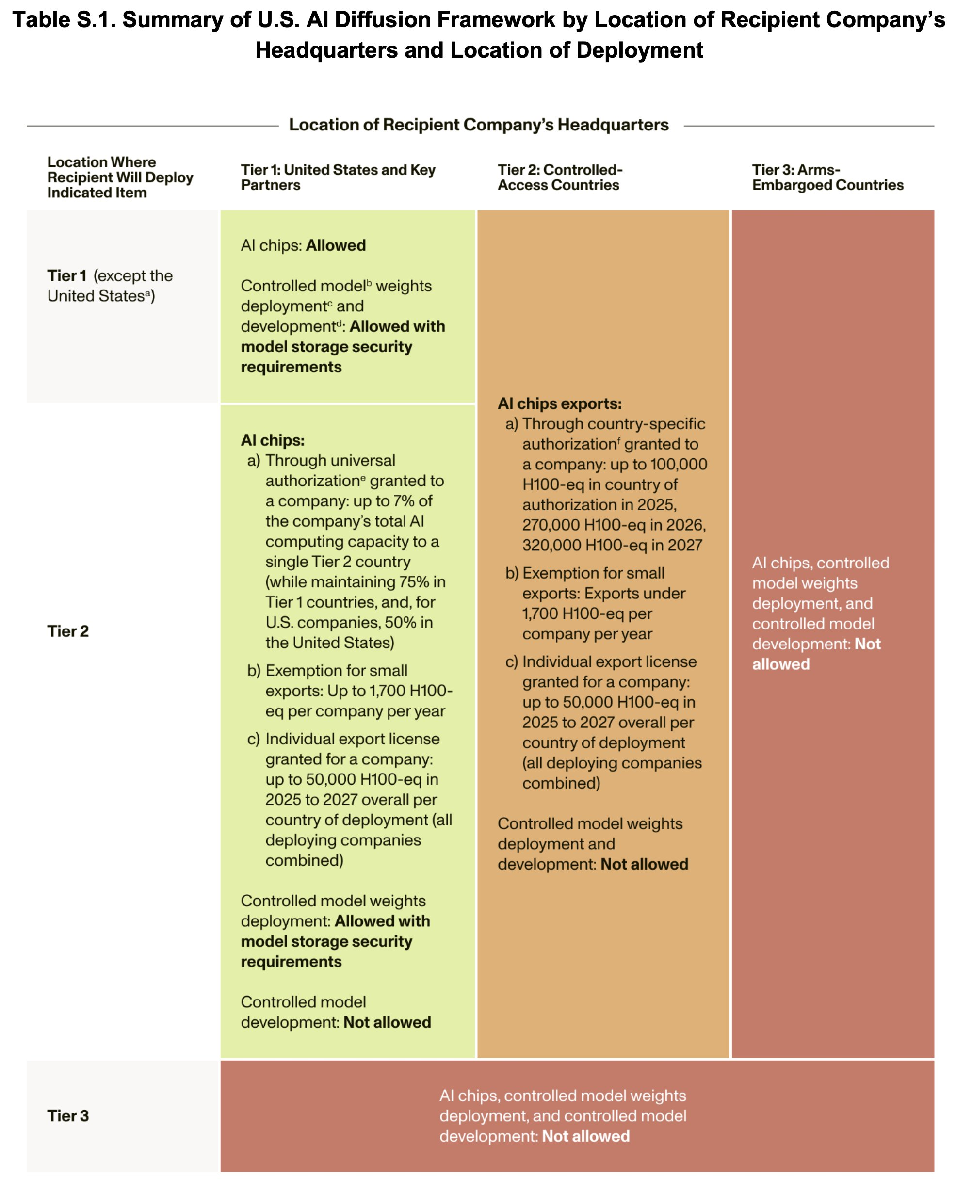 This table gives the best overview: The framework applies rules based on company HQ location and export destination—covering both advanced AI chips and certain model weights.