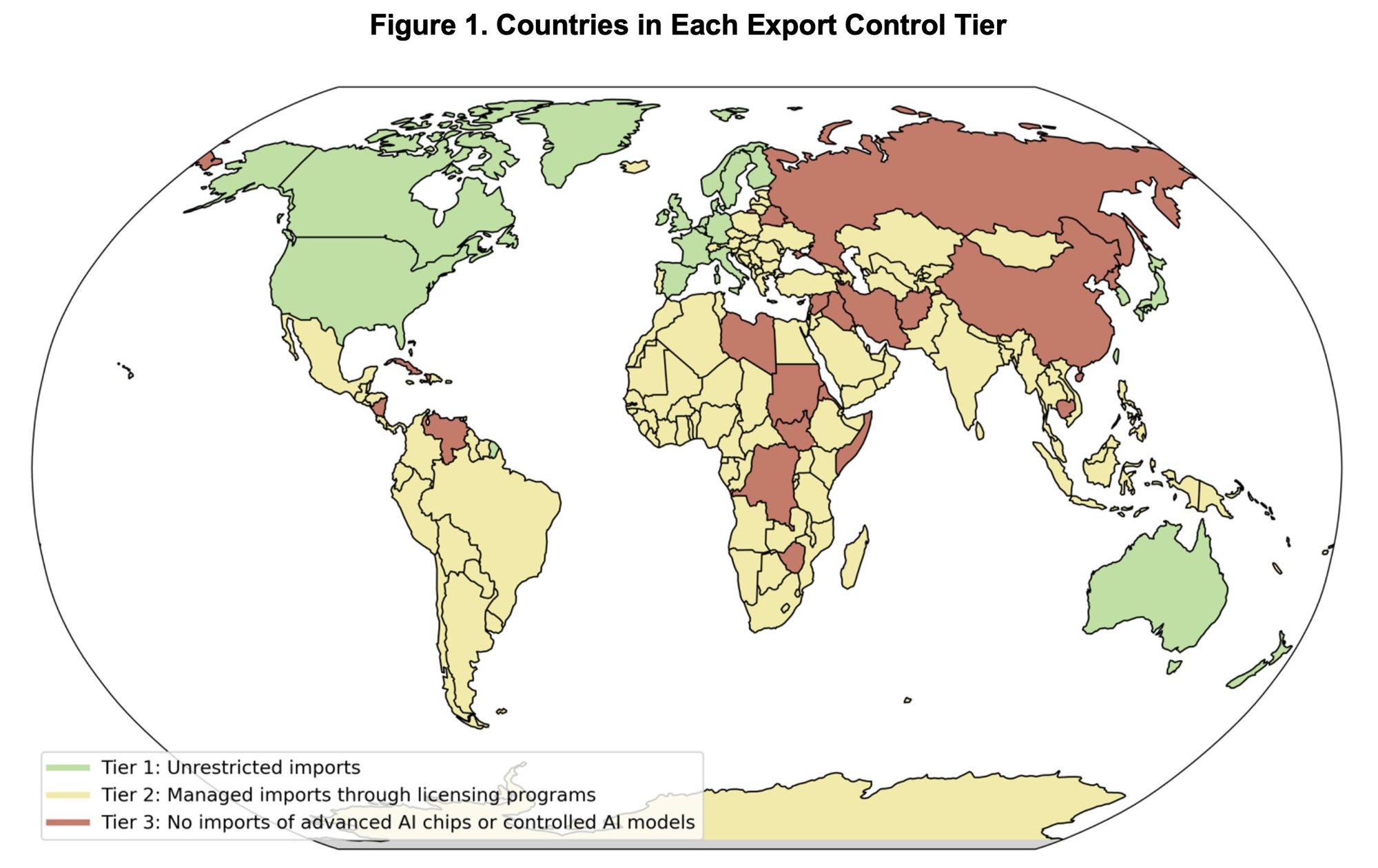 Three country tiers determine access rights and security requirements: Countries in Tier 1 have no import restrictions. Tier 2 countries can receive exports only through authorized companies or obtained licenses, while Tier 3 countries face continued restrictions.