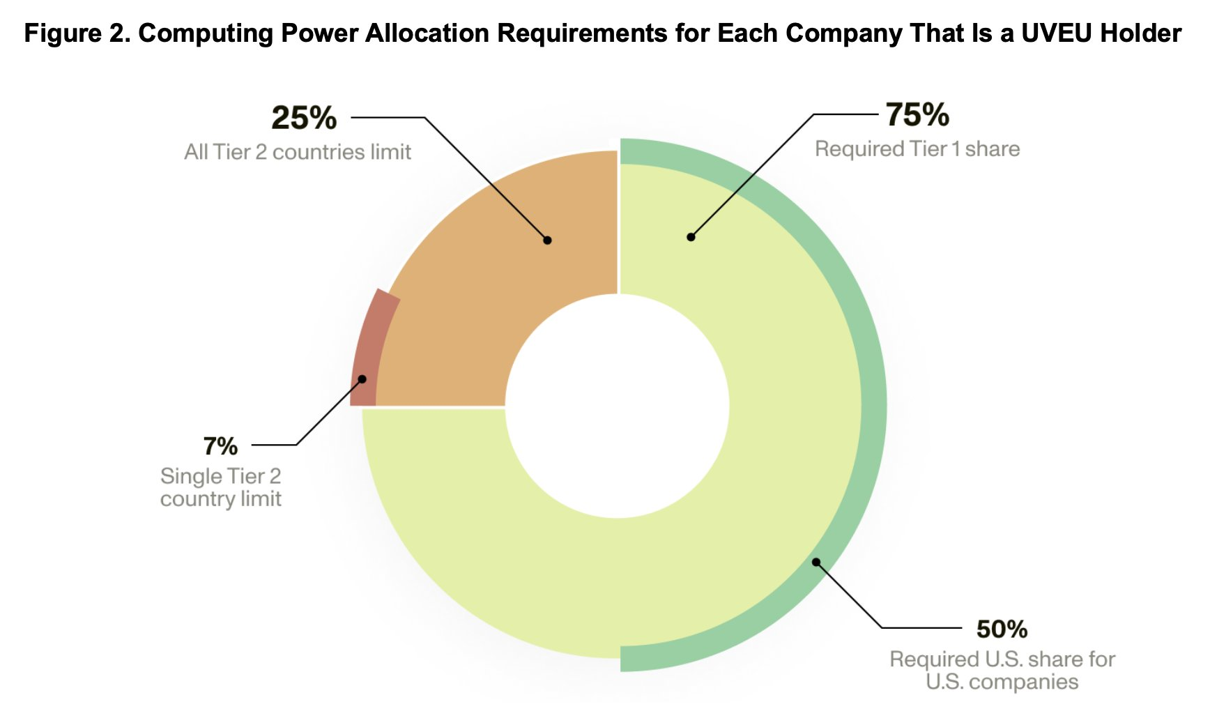 Tier 1 companies can deploy globally through universal authorization, but must keep 75% of compute in Tier 1 countries, max 7% per Tier 2 country. For US companies, 50% of the compute must stay home.